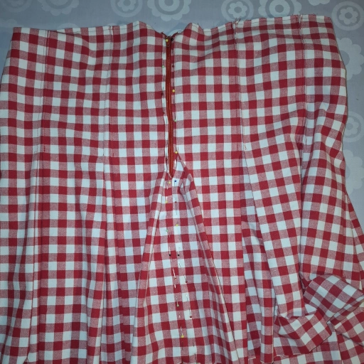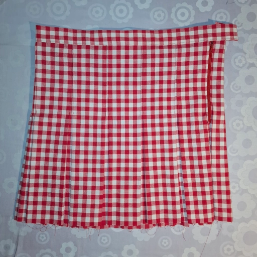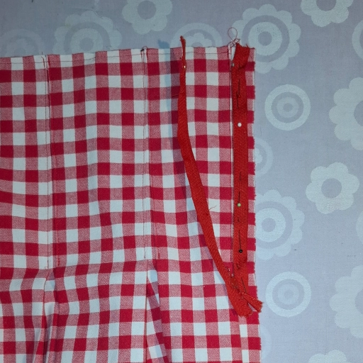 Der Rock ist geschlossen, der Reißverschluss ist zwischen den beiden Falten eingefasst. Wir nähern uns dem Ende entgegen, nur noch der Bund.