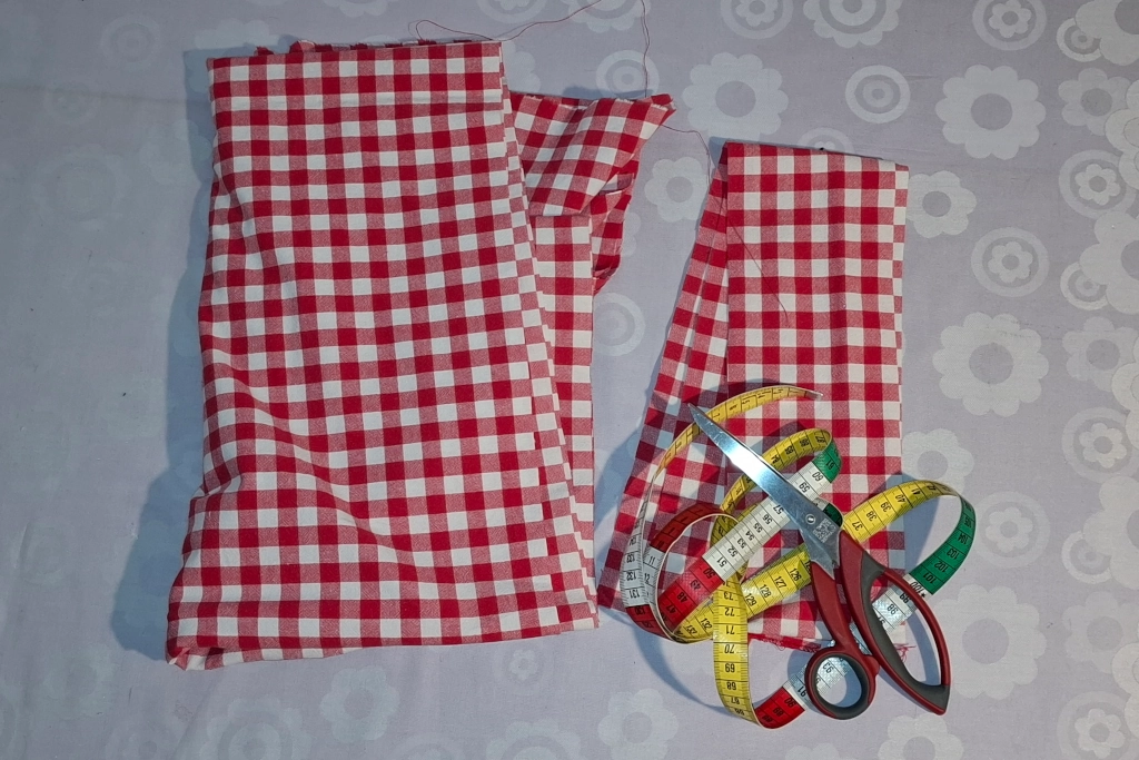 Ich haben ein Webstoff mit kleinen Quadraten gewählt und ich kann mich an den Kanten orientieren, das macht es einfach die Rechtecke sauber zu zuschneiden. Danach habe ich die Stoffbahnen noch mal gebügelt und gestärkt. Das soll es einfacher machen die Falten zu legen.