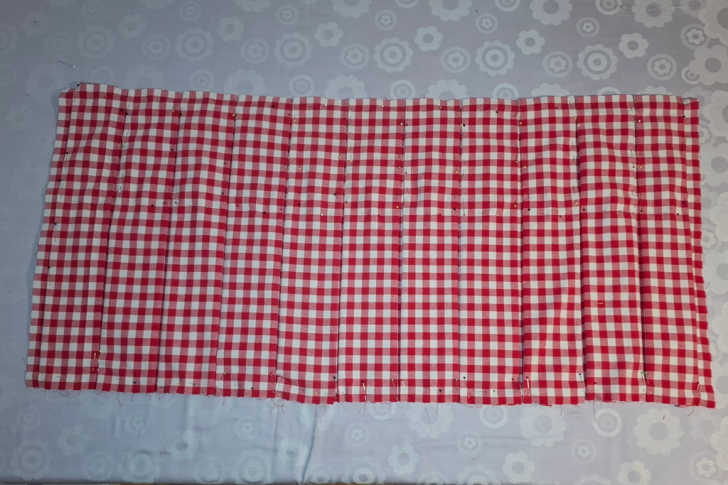 Unser Karoabstand ist ca. 1,1cm. Um sauber auf der Linie zu bleiben wähle ich hier 9cm, das ergibt 10 Falten. Natürlich ist eine Faltenweite nicht vorgeschrieben und kann individuell angepasst werden.