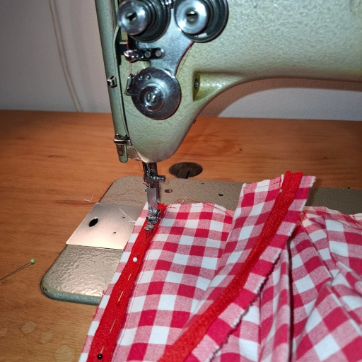 Der Reißverschluss ist von der rechten Seite noch nicht abgesteppt, dieser Arbeitsgang erfolgt erst nach dem schließen des Rocks. Dabei werden auch die letzten beiden Faltenkanten mitgenommen.
